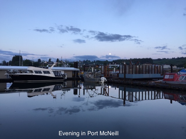 We had been watching friends of ours come south from Alaska on their boat Aquila. We had planned to meet up somewhere in northern BC. We saw him on MarineTraffic earlier today and assumed they would stop in Fury Cove for the night. But then we got a text from him saying that they would be in Port McNeill at 5:30. And they were! They rounded Cape Caution in the afternoon and wind. Go figure. Alan came over and we chatted for awhile, but Linda stayed on the boat. They had some issues they needed to attend to in civilization, so they were (and are) on a mission south.