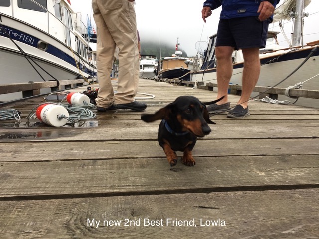 Time to get off these howling boats, so we decided to go for a walk through town. Sue stayed behind on EG so it was just the 5 of us and the 2 dogs. We saw a "marmot" in the rocks just past the top of the ramp, and it appeared to be slightly tame? It just sat there looking at us and started getting closer, even with Lowla barking her head off at it. Got photos. We eventually ran into "Rob" who runs the Darkewaters fishing outfit here. We had heard that they don't have the restaurant open because they ran out of food. But he is one of the people putting on the free pig roast. He said they want to do it every year on this "BC day" long weekend and want word to spread to the boating community so that more people come in. (Where would they put them on the docks?). Anyway, they had both chicken and a beef roast stuffed inside the pig as well, and were providing salad and buns and dessert too! All we had to bring was a beverage. How cool is that?
