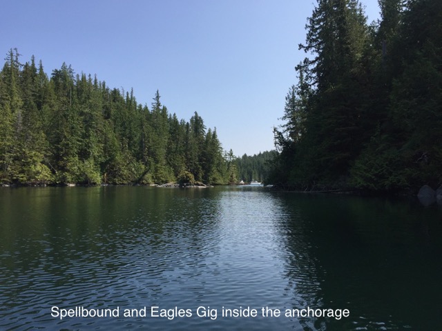 Fitz Hugh was a little choppy in places, like passing Hakai Passage, but not too bad. We decided to check out Greene Island Anchorage as it was close for getting out into the sound, and wasn't too squeaky to get out of if it was socked in with fog in the morning. It turns out it was a lovely cozy anchorage and the sun came out just after we arrived. We hopped in the dingy's and went touring around all the little channels. Then Greg and Byron went fishing for about an hour, but alas, nothing caught. Back to Spellbound for salmon dinner, and an early night.