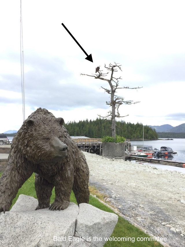 They have a coffee shop here with nanaimo bars. Guess what we did? We watched the world go by with Miss B outside the coffee shop. It's still early in the season here, so there is really not much to watch. There is a ferry over to Bella Bella and so when it arrives, the population doubles! We walked over to the fishing dock and chatted up a young guy working there. He was out the day before and got 33 spring salmon, but he said no one was more surprised than him! Very unusual for this time of year. Their season doesn't really start until July 1st - Canada Day. And August is the busy season. So not a long season at all! We told him we'd be back in August to try some fishing 😆.