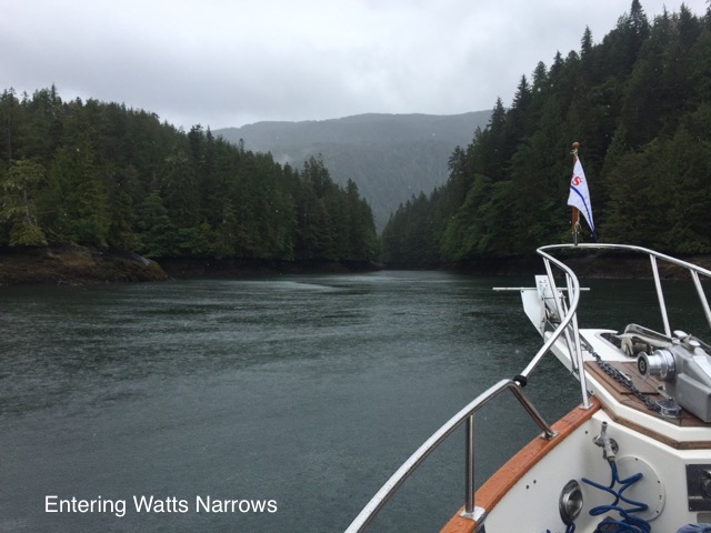 Our plan was to go up to Baker Inlet today. It's supposed to be "the" most protected inlet of them all in Grenville channel. You need to go through Watts Narrows to get into the inlet, and apparently thought not necessary entering at slack water is easiest. So there was a slack around 11:30 meaning we left around 8:30 to get there in time which seemed civilized. There is a point in the middle of Grenville channel where the directions of the floods/ebbs switch. So we had to fight the Ebb going up a bit, but once we passed "Evening Point", then the Ebb was going with us and we got a push. We arrived at Watts Narrows about 10 minutes early.