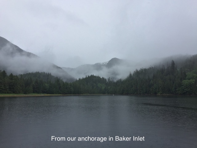 It rained hard last night, we could hear it on the aft cabin roof. We woke up pointed in the same direction in the same place, so we'll call that a win. Didn't see much in the way of birds or wildlife here yesterday at all. Alaska Dream was gone very early so we never did find out who was on it.