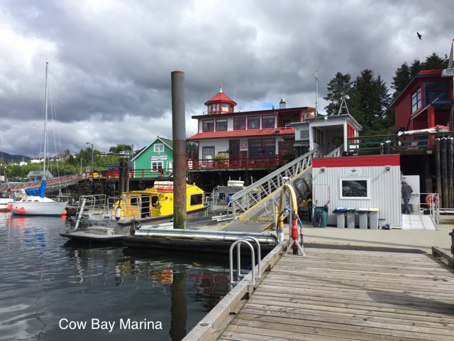 Back to the boat where we put stuff away, and then notice a large familiar boat arrive and tie up on the breakwater dock. It was Stella Maris with John and Judy who we met in Port Harvey. We deposited our recycling and then stopped by to say Hi on our way to the grocery store. It was great to catch up and they also were planning on going to the famous "Cow Bay Cafe" for dinner, we made reservations for the 4 us. We picked up some ice and some pre-made food for the trip tomorrow.